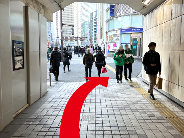 ①西部新宿駅東口から出ます。西部新宿駅を背に右折します。